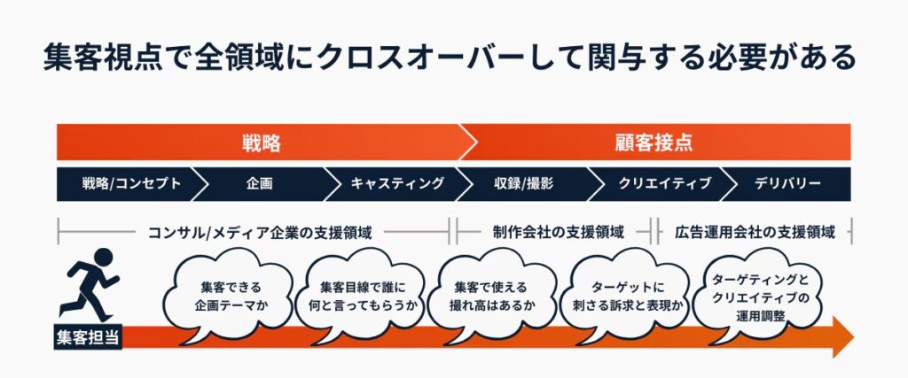 | 💡Point集客担当がコンテンツ企画から収録・制作まで一貫して関与するクラウドツールを活用し、企画者や広告担当も即座に広告修正・再入稿ができるようにするビジネスサイドも最低限のデザイン・動画編集スキルを持つ |