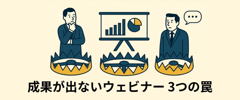 成果に直結しないウェビナーの課題として多く見られるものに、以下3つの失敗パターンがあります。