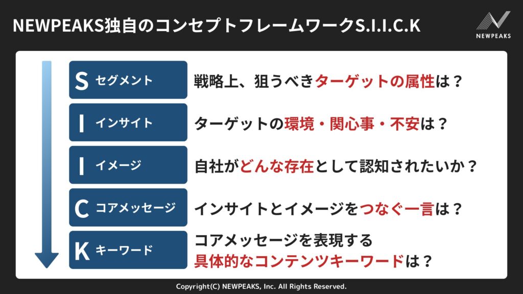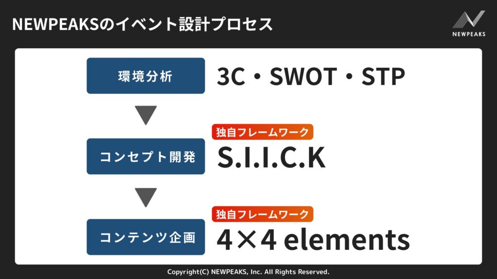 NEWPEAKSでは、独自のフレームワーク「S.I.I.C.K」や「4×4 elements」などの用いながら、戦略から顧客体験までを一貫して設計するプロセスを支援しています。